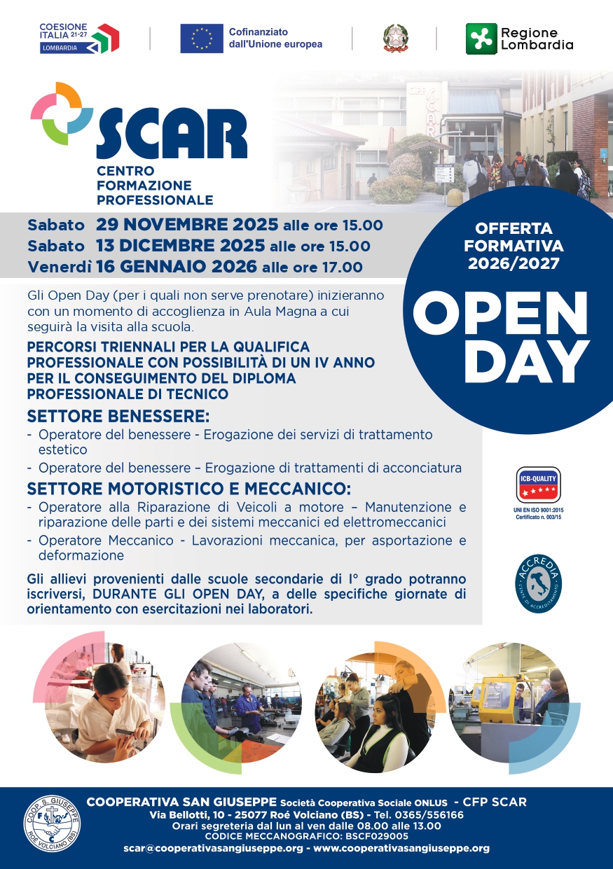 Il Centro di Formazione professionale SCAR, accreditato con Regione Lombardia e gestito dalla COOPERATIVA SAN GIUSEPPE – Soc. Coop. Soc. ONLUS, istituisce Corsi triennali diurni di istruzione professionale (IEFP) in DDIF (diritto dovere di istruzione e formazione) validi per l’assolvimento dell’obbligo scolastico, con la possibilità di un quarto anno aggiuntivo (e per il settore Benessere anche la specializzazione).